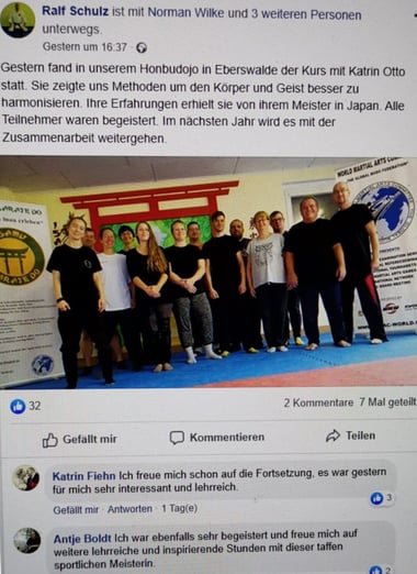 Am Samstag den 02.11.2019 hatten wir die wundervolle Gelegenheit einen Info-Kurs für Kiaijutsu im Isamu Karate-Dojo in Eberswalde geben zu dürfen. Vom Herzen vielen Dank an Ralf und seine Schüler für die gelungene Organisation und rege Teilnahme! Es hat mich sehr gefreut mit euch zu wachsen und das gesammelte Wissen in einem so wundervollem Dojo weiter geben zu können!